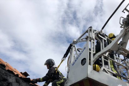Los bomberos desplazaron un camión escala que fue necesario para acceder al tejado de la vivienda, que quedó afectado por las llamas, al igual que zonas del interior.