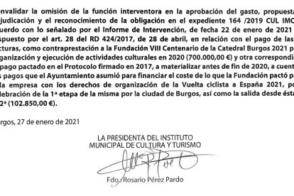 A las pocas horas, ese 30 de diciembre, esta entidad envió al Ayuntamiento de Burgos sendas facturas por el patrocinio de las actividades culturales del año 2020 (700.000 euros) y por el patrocinio de la Vuelta Ciclista a España 2021 (102.850).