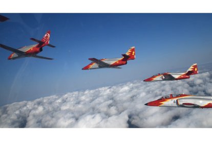 Los componentes de la Patrulla Águila han estado practicando el vuelo que realizarán mañana sobre la Catedral con motivo de su VIII Centernario.