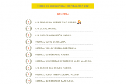 La cuarta posición la ocupa este año el Hospital Clinic de Barcelona, que baja dos puestos respecto a 2019, seguido del Hospital Vall d’Hebron, en quinto lugar, que escala una posición en el ranking.