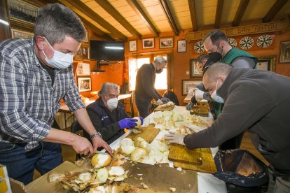Un grupo de cofrades corta parte de los 250 kilos de cebolla que se utilizarán hoy en el cocinado. T. A.