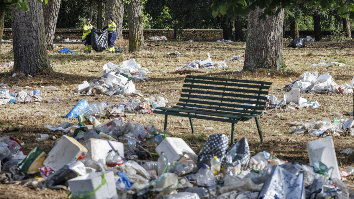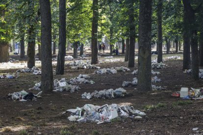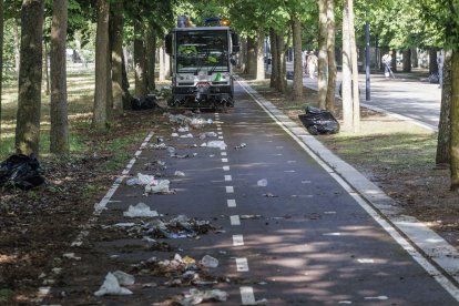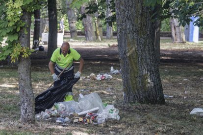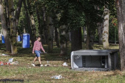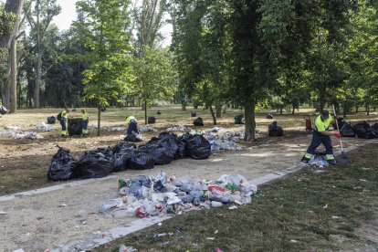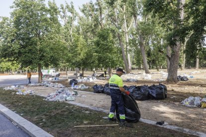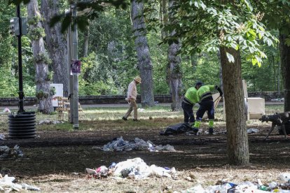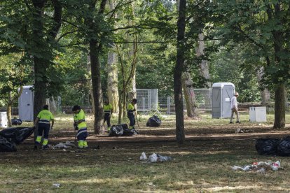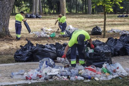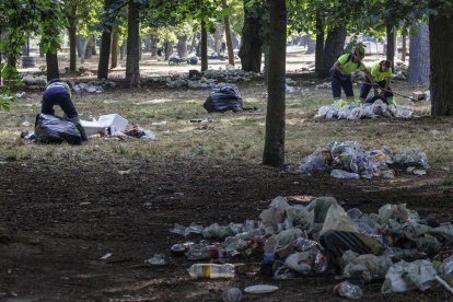 Los servicios de limpieza continuan recogiendo las toneladas de basura que quedaron en el parque tras la asistencia a la fiesta de más de 35.000 personas
