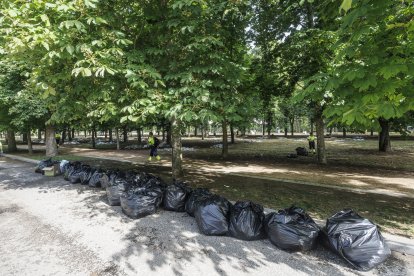 Los trabajadores van acumulando la basura en grandes bolsas para que sea recogida después.