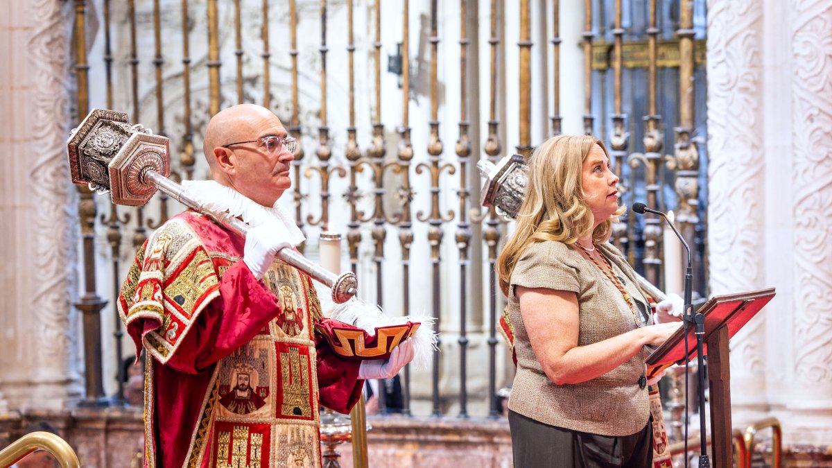 La alcaldesa de Burgos, Cristina Ayala, fue la encargada ayer de pronunciar el tradicional voto de la ciudad a Santa María la Mayor durante la celebración de la solemnidad de la Asunción en la catedral de Burgos. En su intervención, Ayala elevó una petición centrada en los colectivos más sensibles y en el futuro de la ciudad. En sus palabras dirigidas a la Virgen le pidió que «cuides de nuestros jóvenes», que «inspires a la sociedad para honrar a nuestros mayores», que «nos ayudes en nuestros proyectos para mejorar la ciudad» y que acompañe «a todos los que sufren dificultades en la vida».