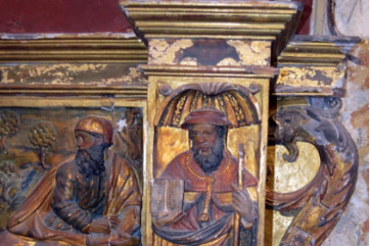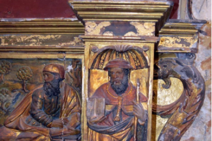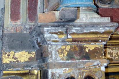 Estas patologías se han generado por el cambio radical de humedad y temperatura, lo que ha provocado el movimiento de la madera y la pérdida de cohesión entre las partes. Pero tampoco debemos olvidar las actuaciones realizadas por la mano del hombre y que afectan a la policromía. Claramente podemos ver repintes, con algún tipo de pintura en amplias zonas del retablo. Incluso se han cubierto de yeso algunos detalles de la arquitectura, como los fustes de las columnas para ocultar el estriado original y conseguir un acabado liso más al gusto neoclásico.