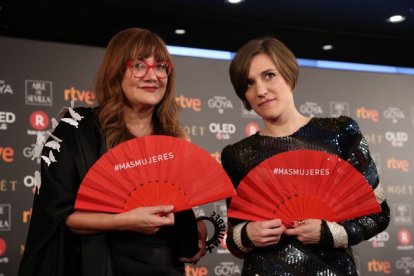 Isabel Coixet y Carla Simon, en la alfombra roja con el abanico reivindicativo. / JUAN MANUEL PRATS