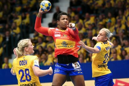 Marta Mangué trata de armar el brazo entre dos defensoras suecas en el debut de España en el Europeo de Suecia.-AFP / FREDRICK SANBERG