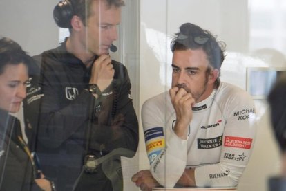 Fernando Alonso abandona el McLaren tras ser informado por radio de que sufría un problema en la dirección.-JACQUES BOISSINOT