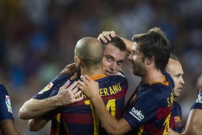 Vermaelen recibe la felicitación de Mascherano y Sergi Roberto en un partido de Liga / JORDI COTRINA