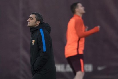 Valverde, con Vermaelen al fondo, en un entrenamiento en la Ciutat Esportiva / JORDI COTRINA