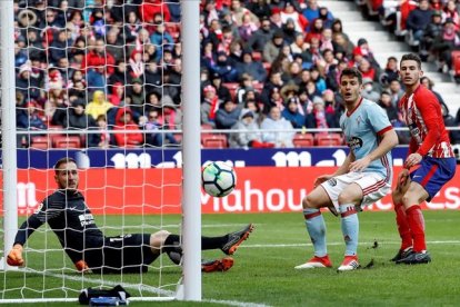 Dos avisos muy serios del Celta después de aguantar sin demasiados problemas durante media hora la atropellada ofensiva del Atlético, en el que apareció Vitolo como titular por segunda vez desde que se insoportó al campeonato en las filas rojiblancas. Tomó posesión de la banda izquierda, mientras por la derecha tenía una presencia mucho mayor Vrsaljko, aunque con poca precisión en sus frecuentes intentos de poner el balón en el área con opciones para Costa y Griezmann, desdibujados en el tramo inicial. De hecho, quien más cerca estuvo del gol en ese periodo fue Godín con un cabezazo en un córner que mandó la pelota ligeramente desviada.