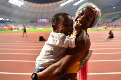 Ni la planta de la británica Dina Asher Smith ni la polvorilla nerviosa desplegada por costamarfileña Marie-Josee Ta Lou fueron suficientes como para intimidar a una madre que parece recién salida de la pelu. Larga cola de caballo al viento y frecuencia endiablada, la pequeña pero formidable caribeña (mide 1,52) realizó una salida y puesta en acción imposibles de seguir para sus rivales. En la meta le esperaba Zyon, el hijo que tuvo hace 25 meses y con quien dio la vuelta de honor al estadio Kahlifa.