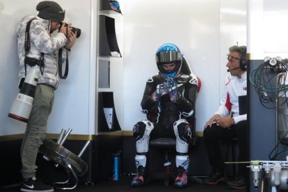 Àlex Márquez (Honda), justo en el momento en que sale del boxe de LCR Honda, hoy, en Cheste (Valencia). / EMILIO PÉREZ DE ROZAS-EMILIO PÉREZ DE ROZAS