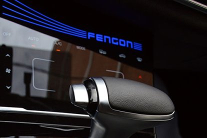 Abrimos las puertas delanteras y nos recibe una luz de cortesía proyectada hacia el suelo. Son unos asientos suntuosos, revestidos en símil de cuero en su totalidad, con la palabra Fengon cosida en los respaldos, un aparente buen agarre lateral, de ajustes eléctricos y calefactados.