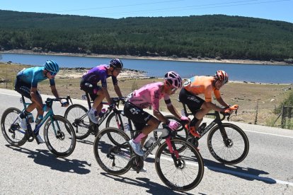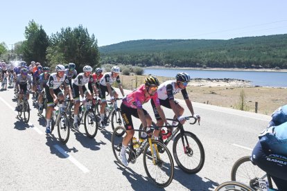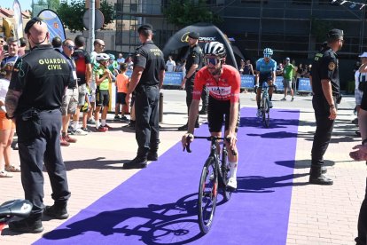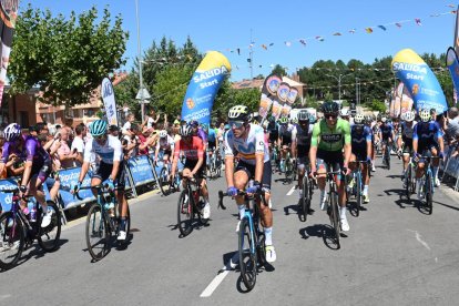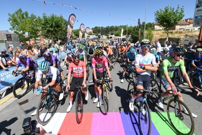 Los protagonistas del pelotón, esperando a tomar la salida en la localidad soriana de Golmayo, donde arrancó la última etapa camino de las Lagunas de Neila.