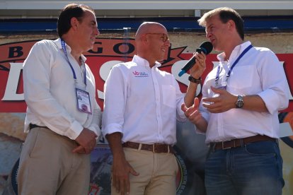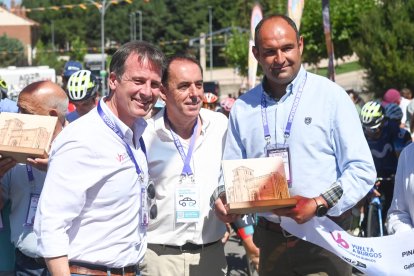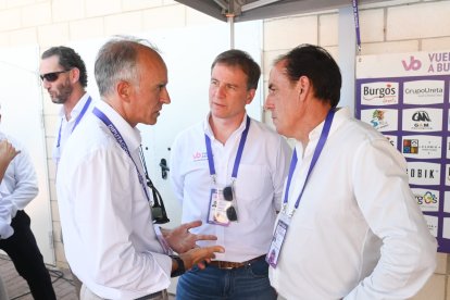 Los presidentes de las diputaciones de Soria y Burgos, Benito Serrano y Borja Suárez, charlan con el director de la Vuelta, Miguel Ángel de los Mozos.