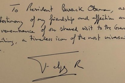 Al término de esta visita, que ha durado una media hora, Felipe VI le ha regalado un libro sobre el mundialmente famoso cuadro de Picasso con la siguiente dedicatoria, en inglés: "Para el presidente Obama, como testimonio de mi amistad y afecto y en recuerdo de nuestra visita juntos al 'Guernica', un icono eterno del arte más universal".