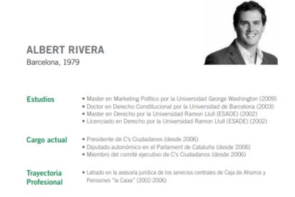 El primero conduce a una página del Círculo de Economía del 2015 en que se sostiene que Rivera tiene un máster en Marketing Político por la Universidad George Washington, un doctorado en Derecho Constitucional por la Universidad de Barcelona, un máster en Derecho por la Universidad Ramon Llull (ESADE) y una licenciatura en Derecho por la Universidad Ramon Llull (ESADE).