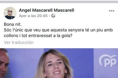 El edil que figuró como independiente en el número cuatro de la lista Gent d'Ador (la candidatura progresista en la que confluyeron socialistas, Compromís y otras sensibilidades y que logró arrebatar al PP la alcaldía ) ha colgado en la red social una fotografía de la dirigente popular con el siguiente texto: "Bona nit. Soc l'únic que veu que aquesta senyora té un piu amb collons i tot entravessat a la gola?".Tras el debate que ha desatado el comentario, Mascarell ha eliminado la publicación de su perfil personal de Facebook y pedido disculpas con un nuevo mensaje en redes sociales en el que ha apuntado: "Ayer hice un comentario en Facebook poco acertado, parece que a muchas personas les ha parecido mal. Por mi parte, si he ofendido a alguien pido disculpas y lo borro". Además, ha proseguido: "Quiero decir que para mí siempre "no es no".